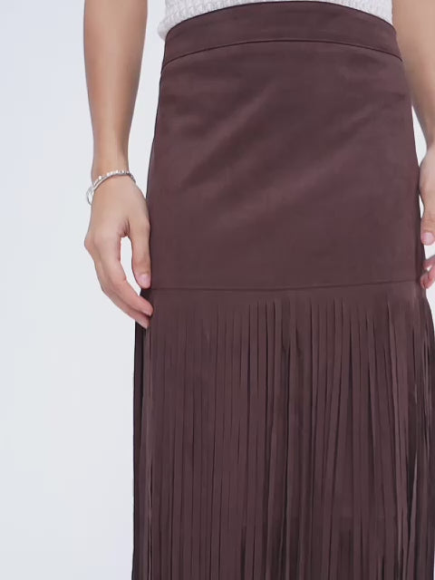 ASOBIO Mid-Rise Suede Fringe Maxi Skirt