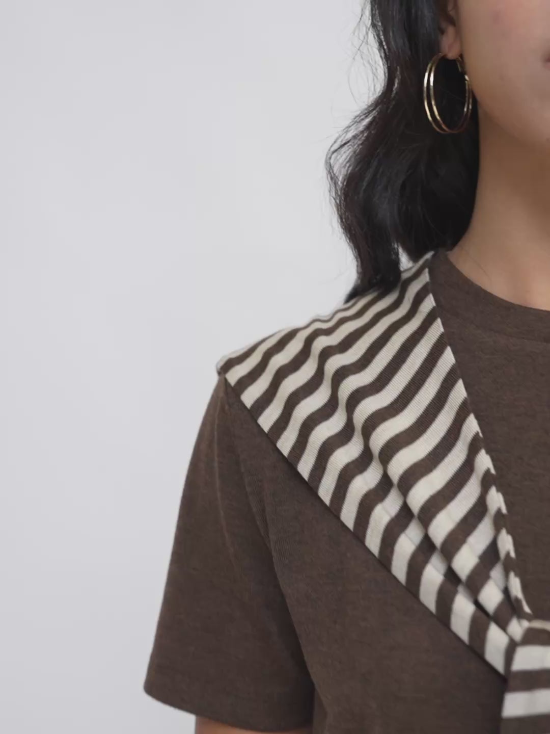 A slim-fit knit tee crafted from medium-weight, soft, and stretchy wool blend fabric that offers comfort while maintaining shape. Features a striped shoulder detail that breaks up the solid tone and adds playful layering. Pair with the matching knit pants for a coordinated, relaxed set.