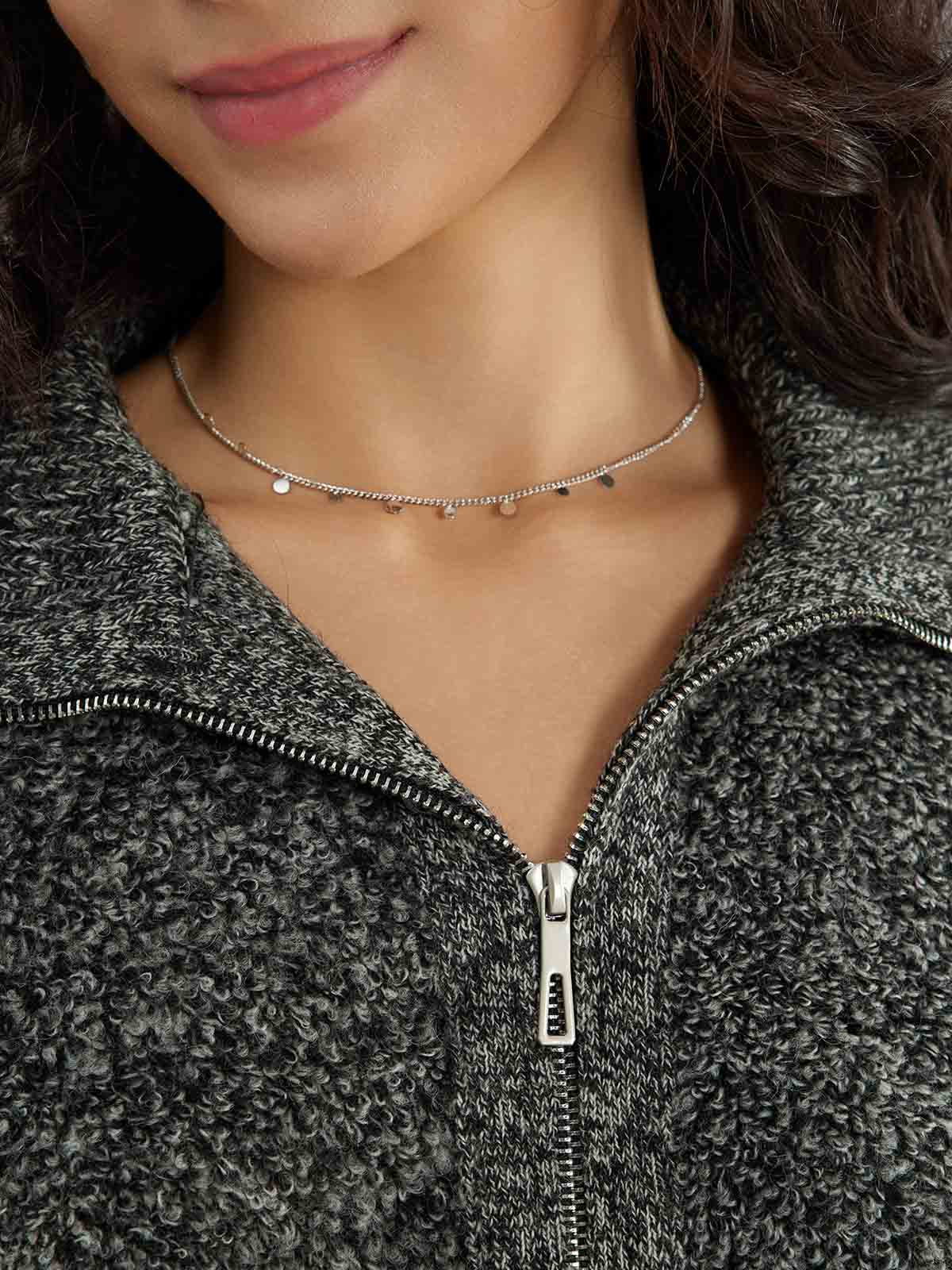 This zip-up cardigan is crafted from 100% pure wool with a deep grey mélange texture that creates natural depth and dimension. Designed with an oversized collar and cropped silhouette, it features rich knit detailing throughout and ribbed cuffs for a clean finish. The pure wool offers a soft, plush feel with natural warmth and structure.