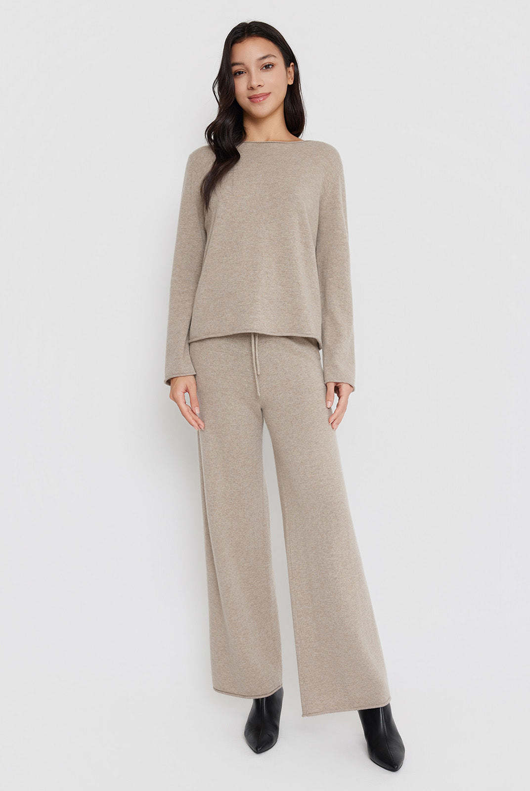 I bought cashmere sweater and the pant, a self-tie waist belt defines the shape accentuating proportions while adding a touch of styling detail.