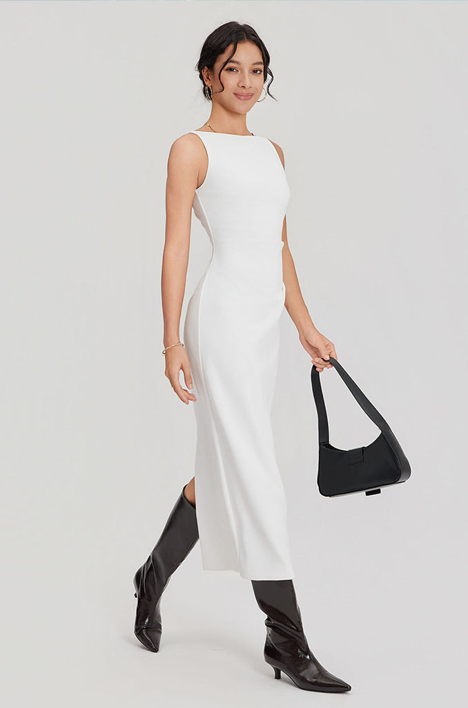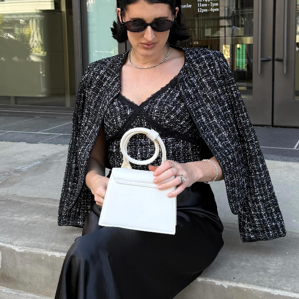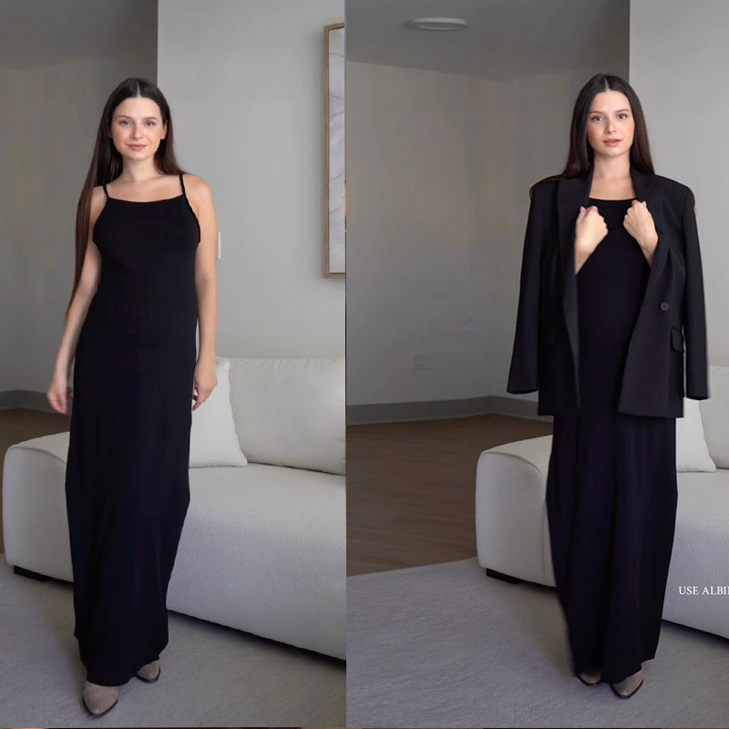 Love how effortless this dress looks and feels! The fabric drapes beautifully and moves with you, and the braided straps add just the right detail. It’s minimal but super chic — I styled it with a tailored blazer for a polished, modern look.