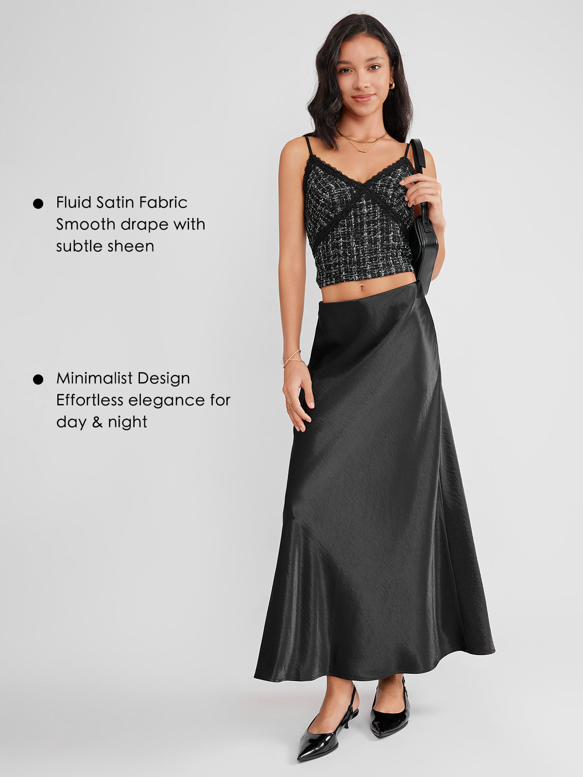 Straight-cut maxi skirt with a clean, minimalist design that elongates the silhouette. Fluid satin fabric drapes smoothly with a subtle sheen, adding effortless elegance to both casual and dressy looks.