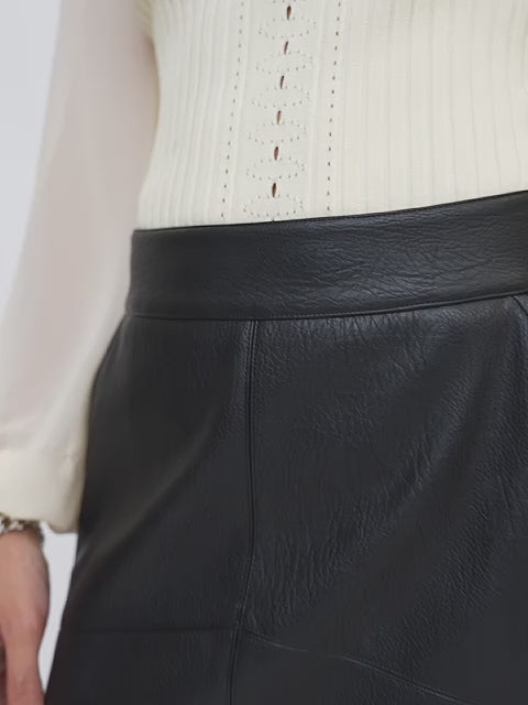 sleek mini skirt finished with a back metal zipper and knit lining shorts for comfort and coverage. Made from supple eco-friendly PU leather with a soft, refined texture.