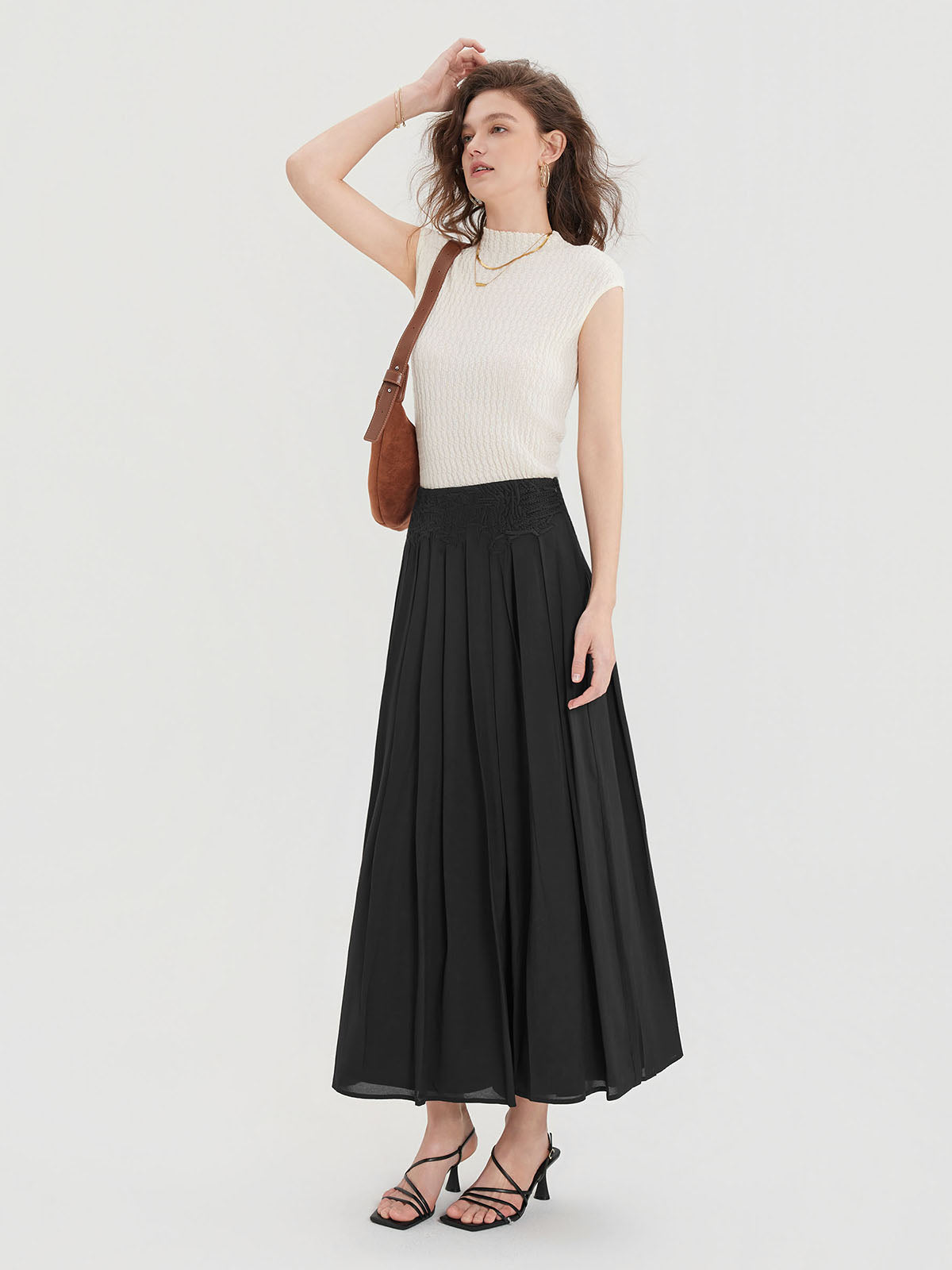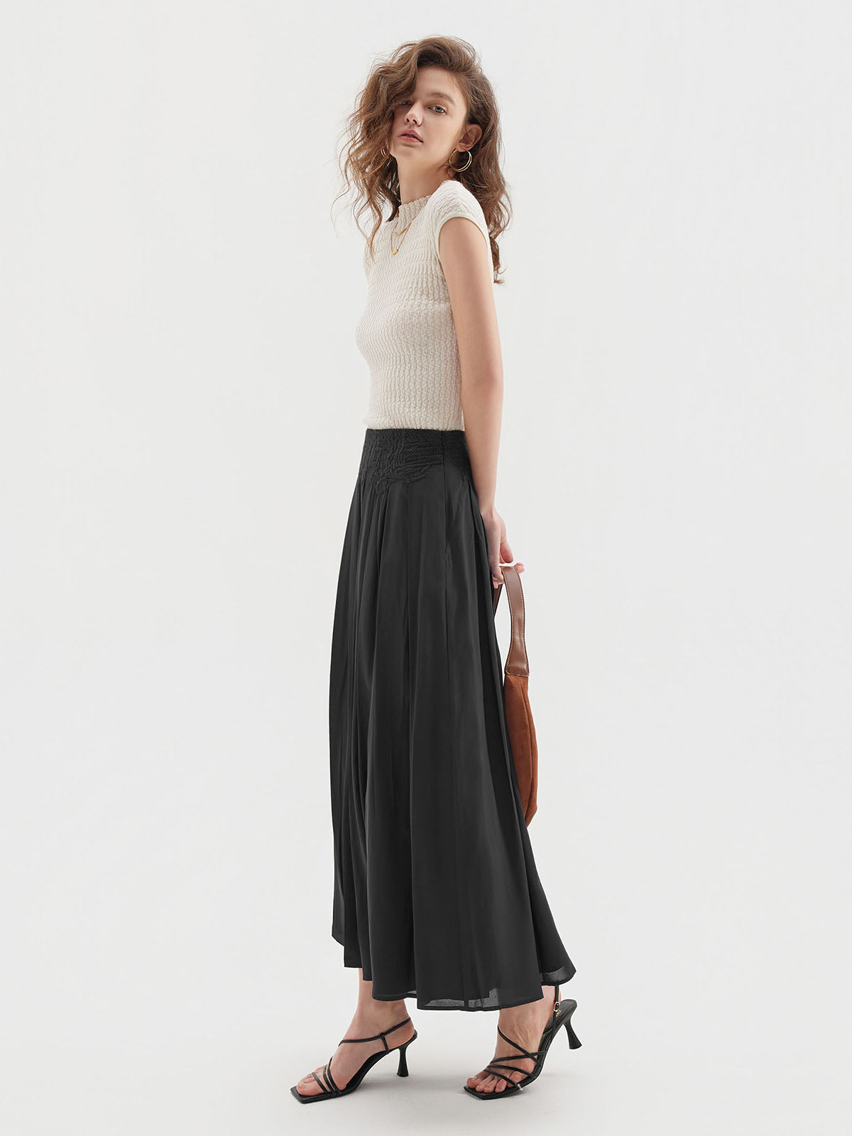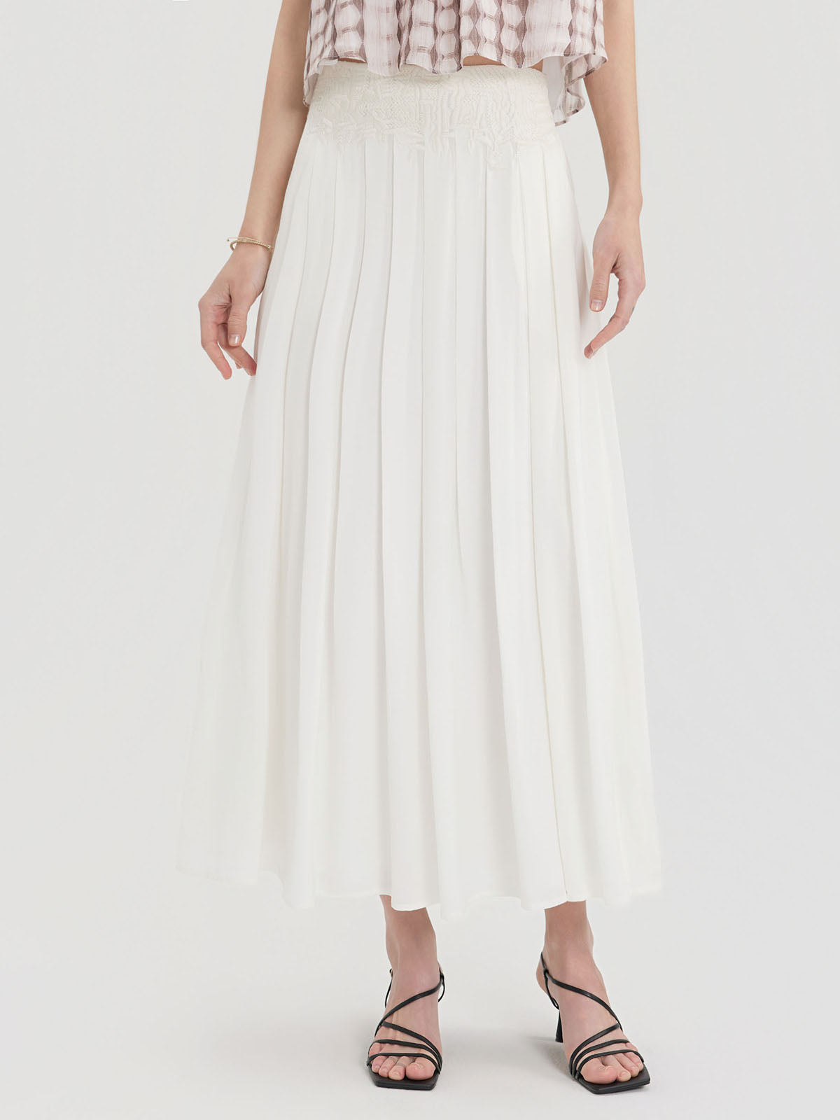 This mid–high-rise maxi skirt features a structured, pleated waistband finished with intricate embroidery for an elevated look. The fluid, full silhouette drapes effortlessly, creating soft movement while subtly elongating the legs. Designed with practical side pockets and a concealed side zipper for a clean, refined finish.