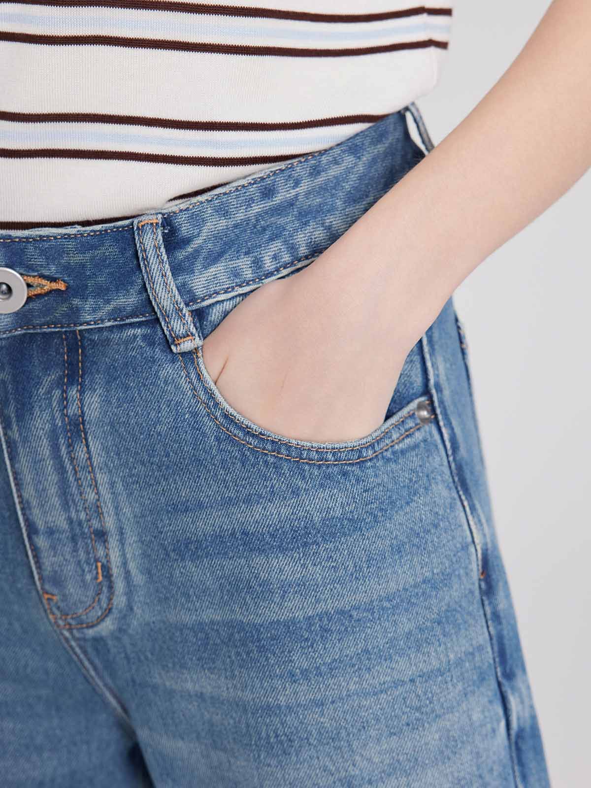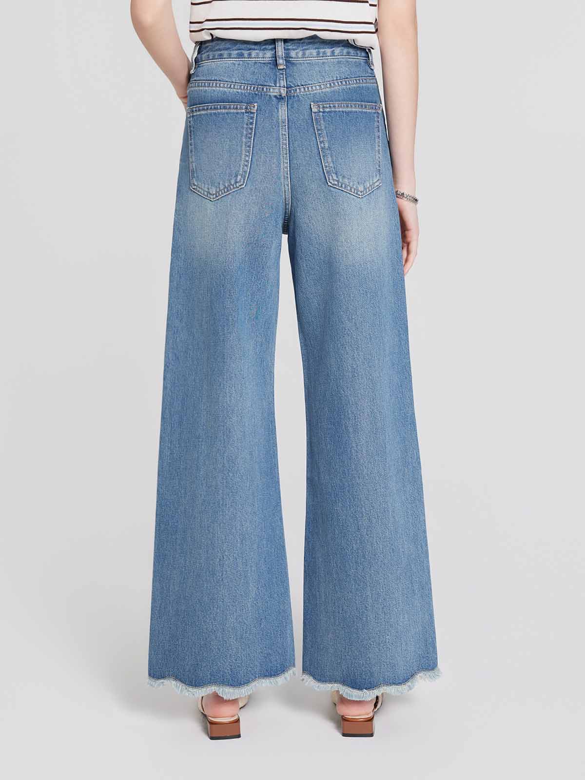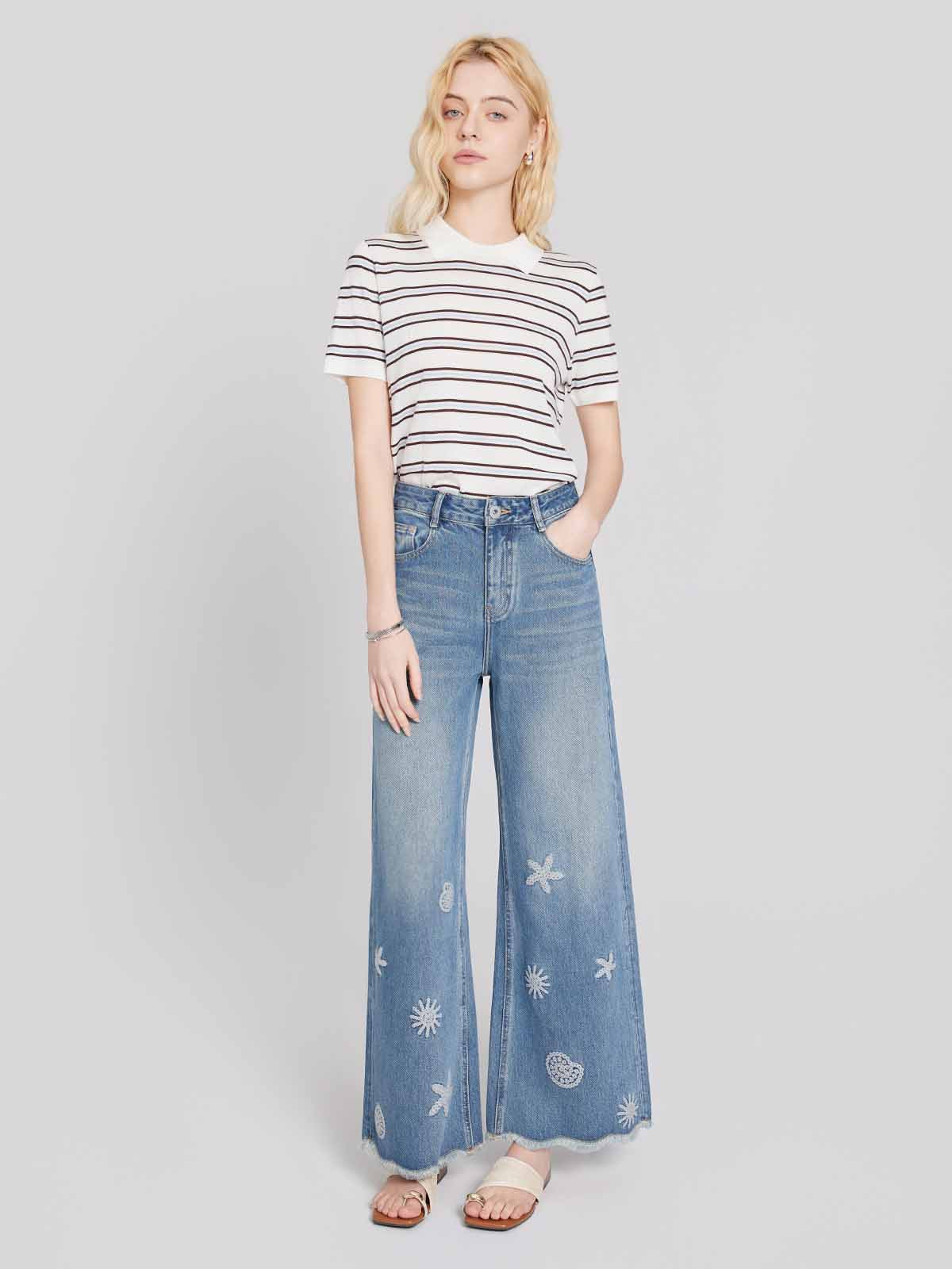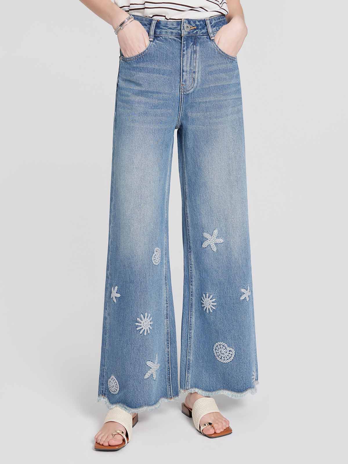 The Ocean Print Jean is a high-rise slim style with a full-length cut and a graphic, ocean-inspired pattern. Designed to lengthen the figure while adding a bold visual accent.