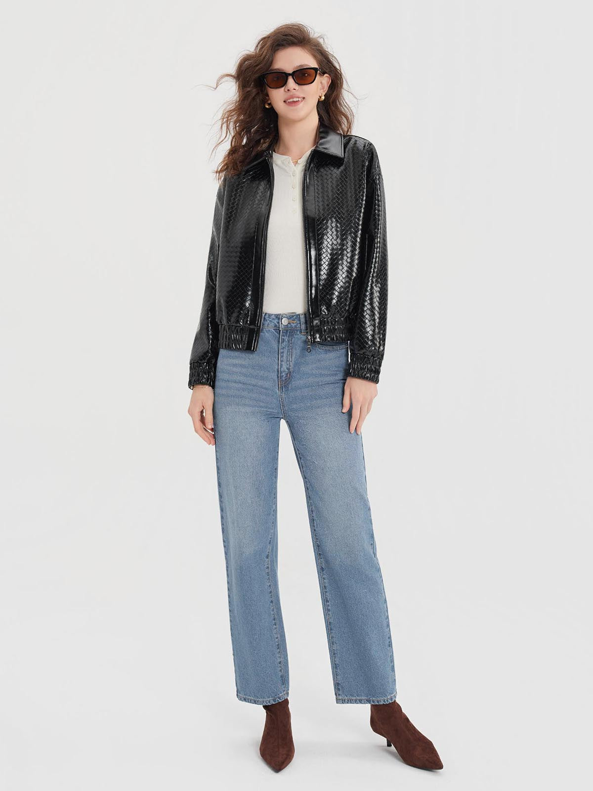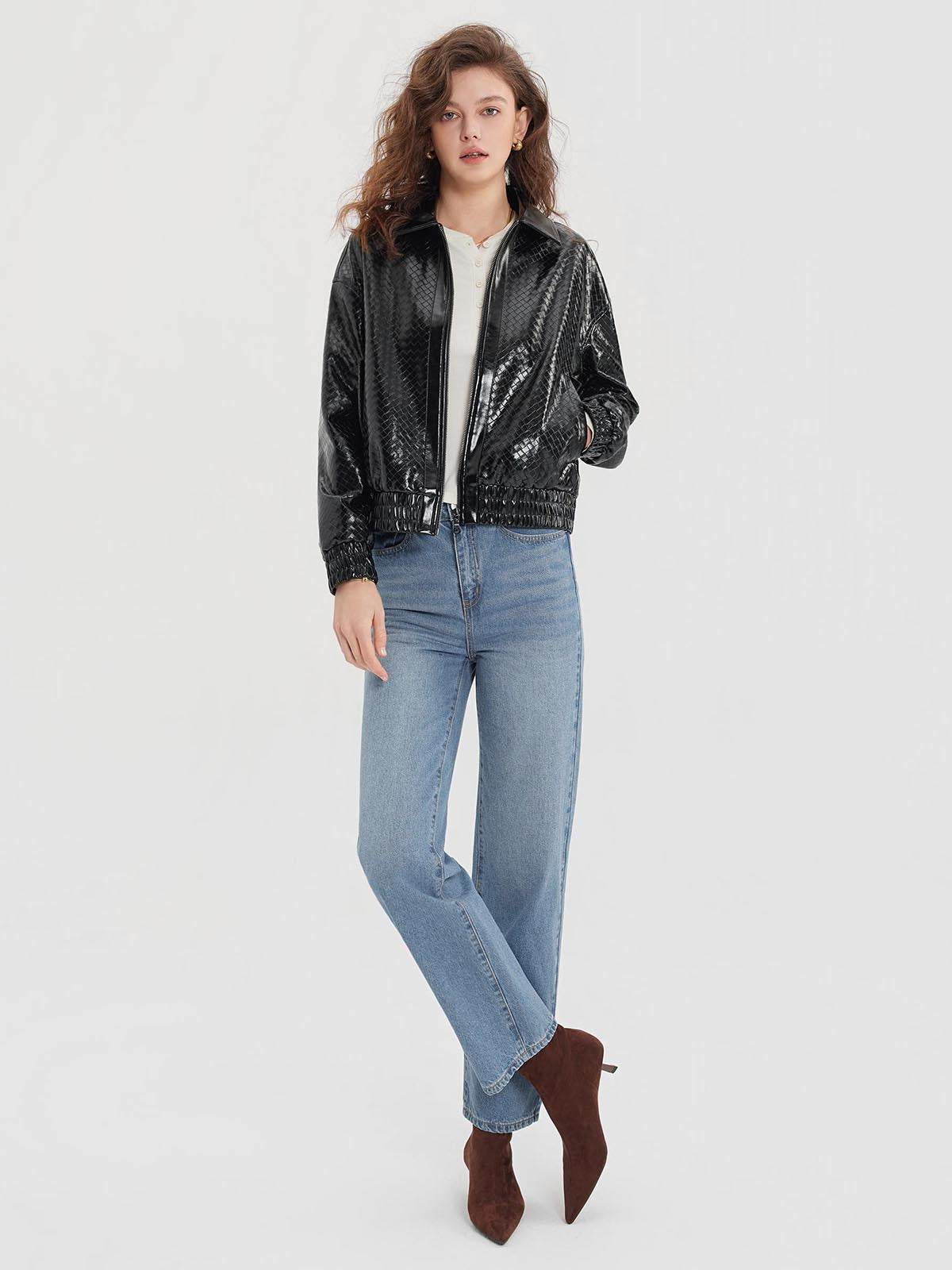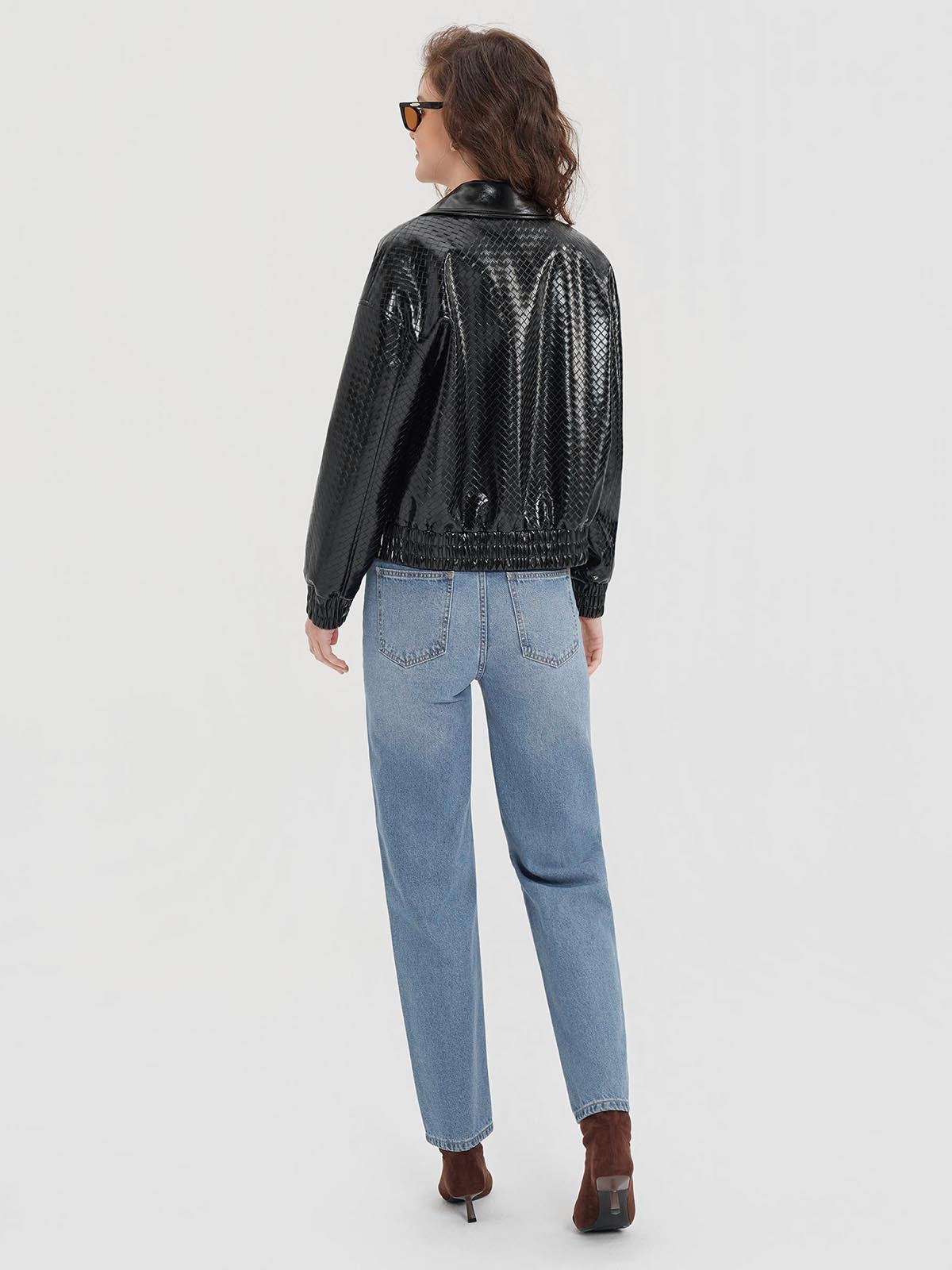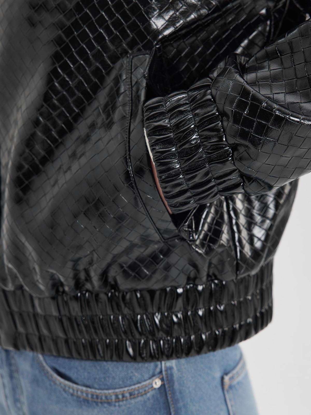 This is a cropped jacket made from black PU with a woven-texture finish for added depth and refinement. Designed with a classic collar, zip-front closure, and elasticated cuffs, it balances a clean, structured look with everyday ease. The shortened length subtly elongates the silhouette, making it an effortless statement layer.