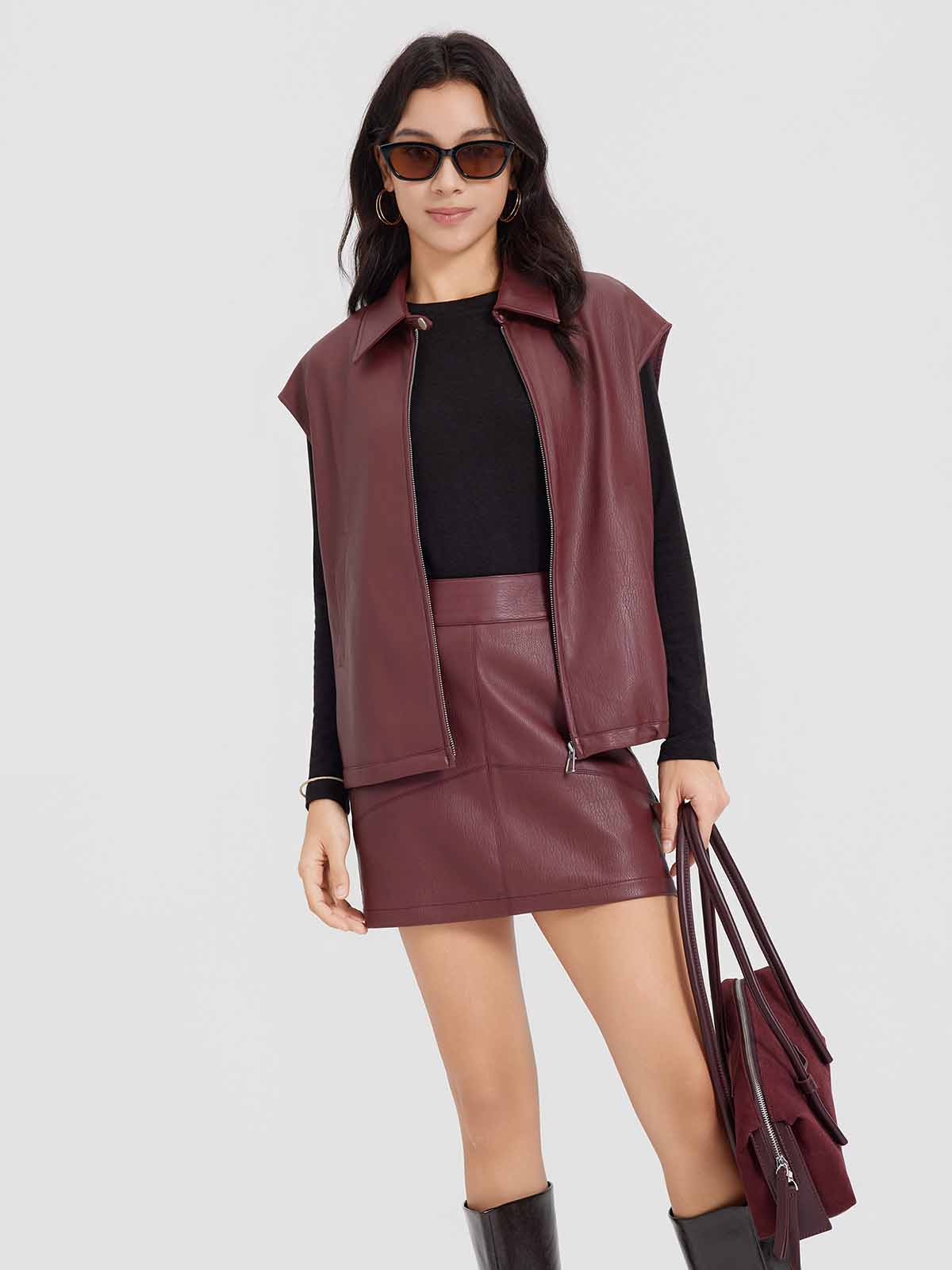 This is a collared faux leather vest with an elastic hem and adjustable side tabs for a customizable fit. It’s made from supple vegan-friendly faux leather that has a smooth hand and structured feel.
