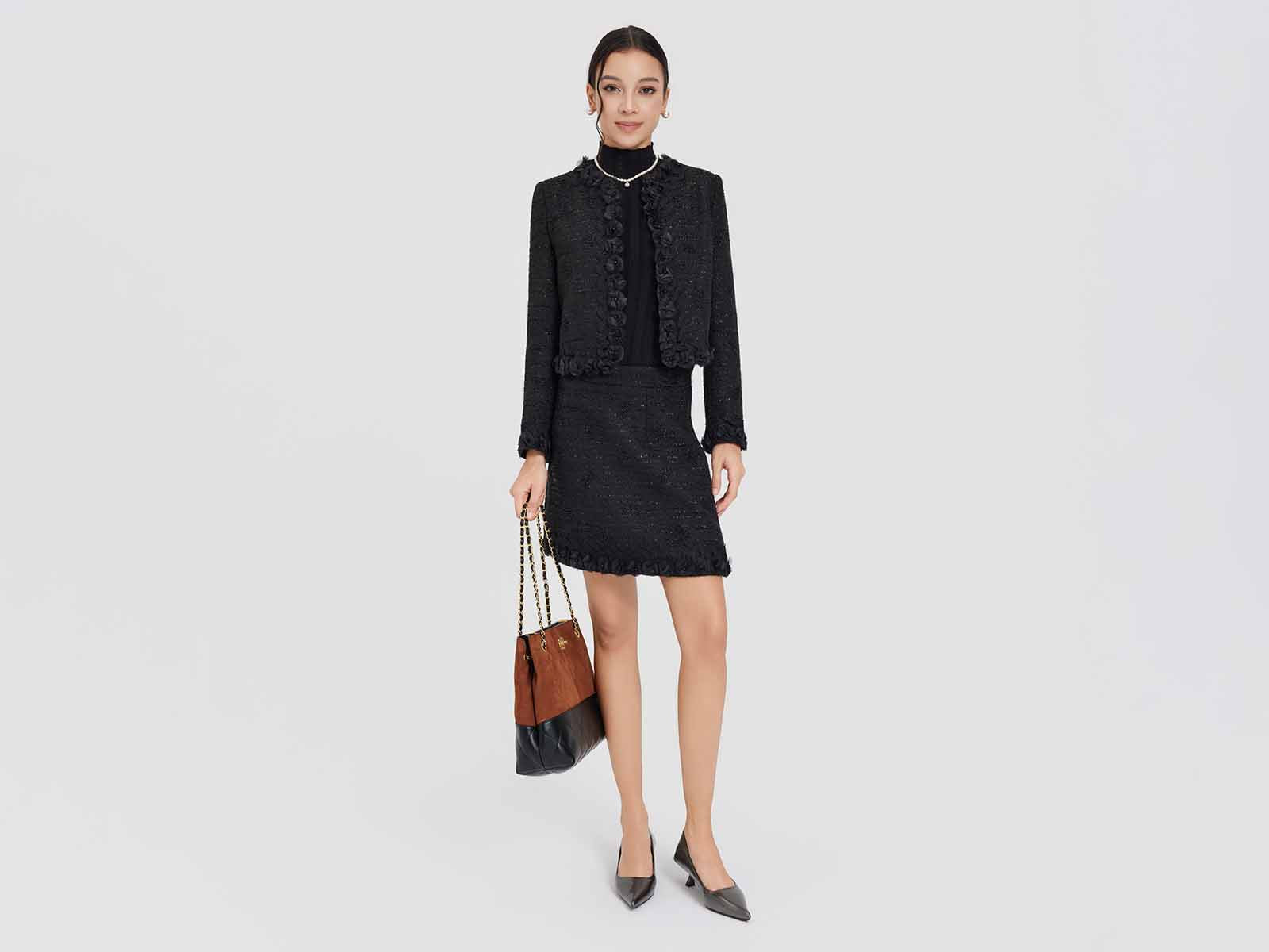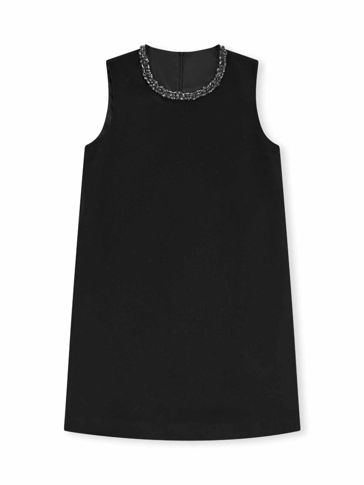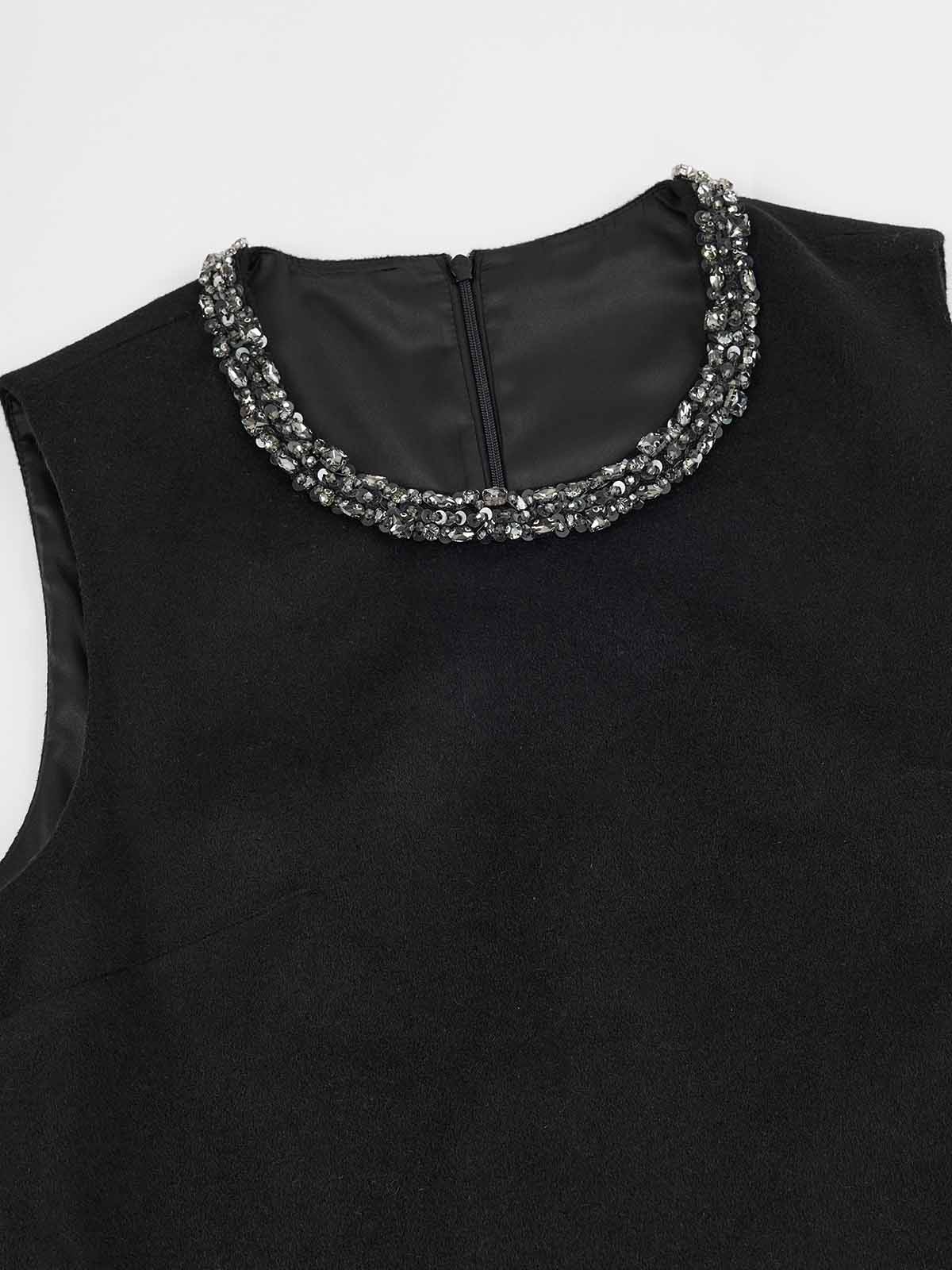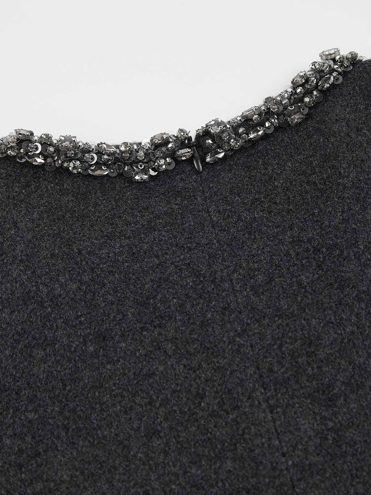 This is a straight-fit sleeveless dress with an elegant beaded neckline and an invisible back zip closure. It’s crafted from a wool-cashmere blend in refined boucle texture, designed to flatter while offering warmth and structure.