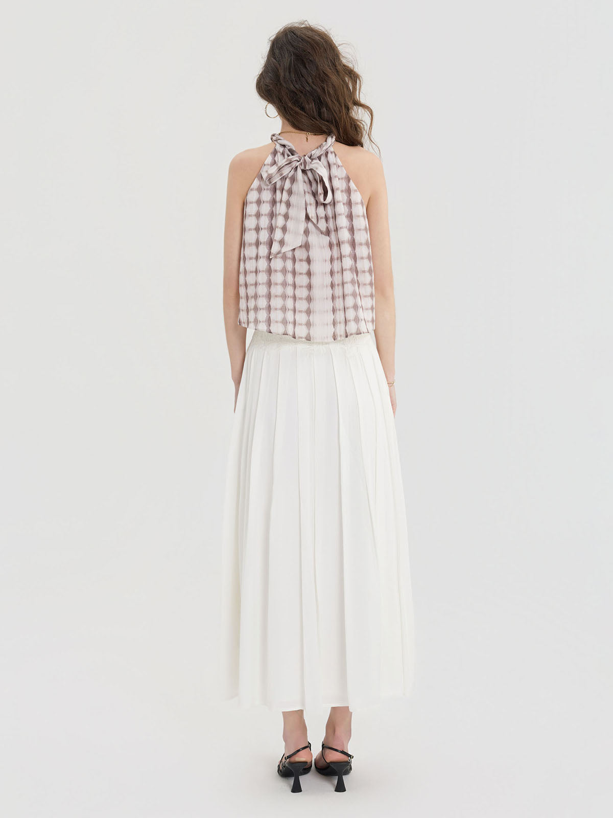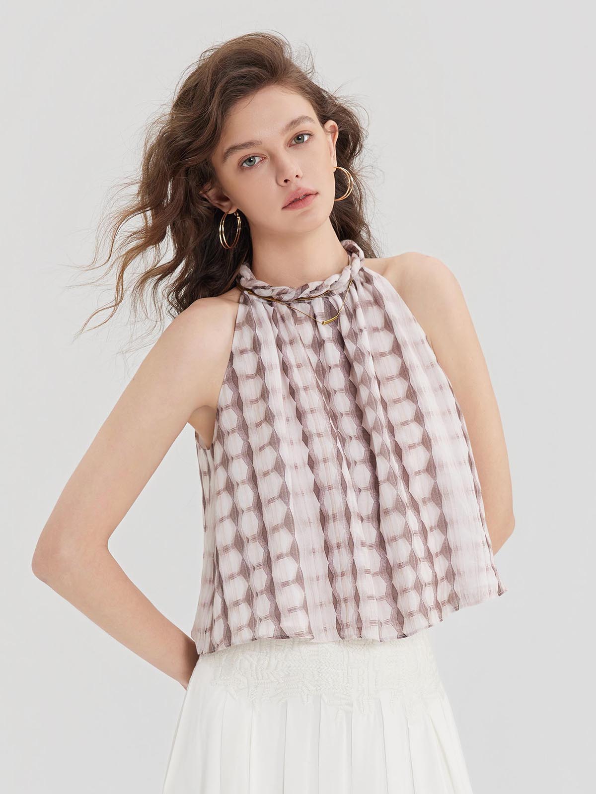 This halter-neck top is made from a smooth, breathable TENCEL™–linen blend with a softly structured drape. The gathered neckline and subtle geometric texture add refined detail while highlighting the shoulders and neckline. An elevated warm-weather essential with a clean, modern feel.