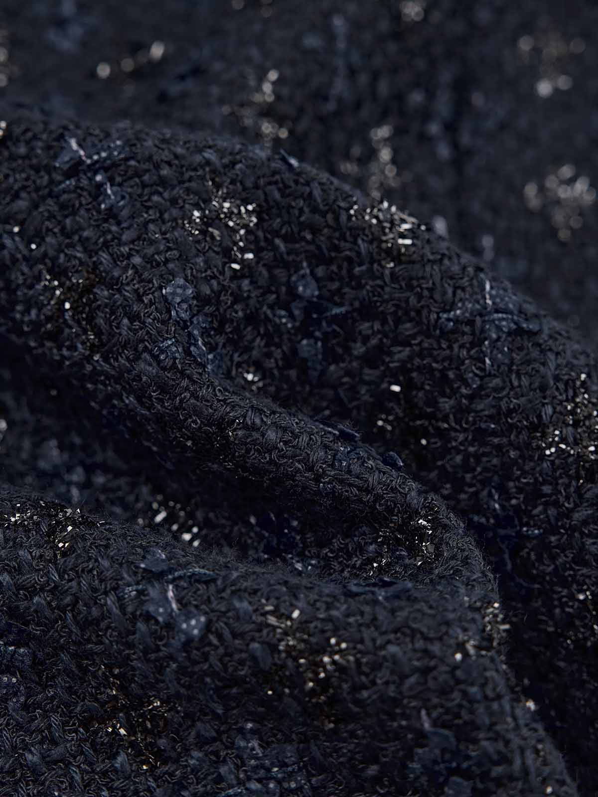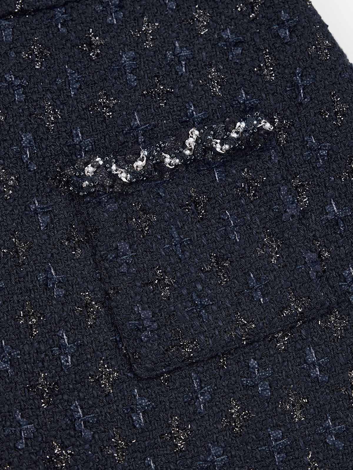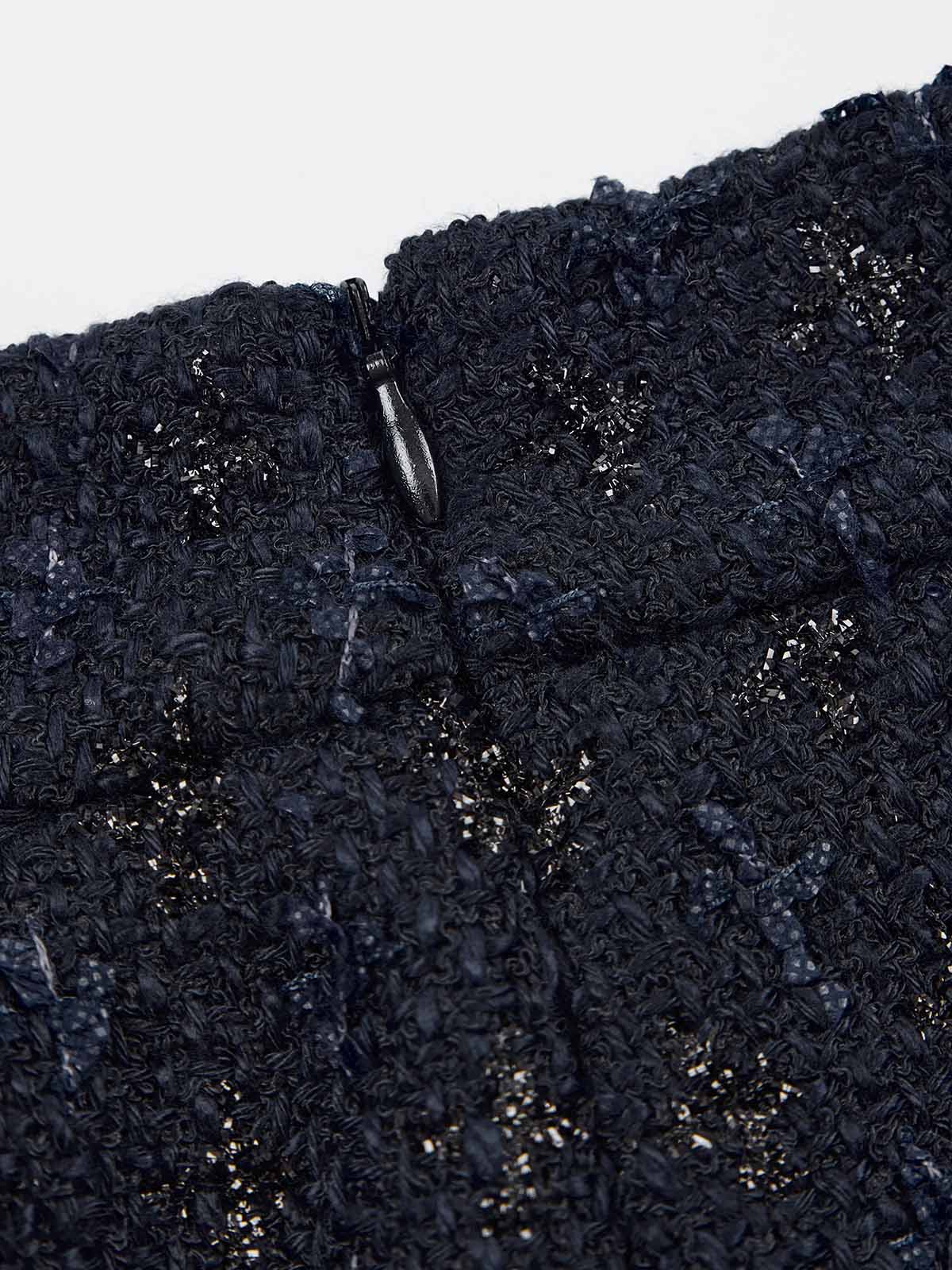 This mini skirt is crafted from a textured tweed fabric with subtle blue and gold speckling. It features two front pockets trimmed with signature braided detailing and a fringed hem for a refined yet effortless finish.